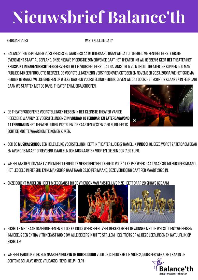 - Balance’th 6 september 2023 precies 25 jaar bestaat!!! Uiteraard gaan we dat uitgebreid vieren! Het eerste grote evenement staat al gepland, onze nieuwe productie ZOMERWENDE gaat het theater in!! Wij hebben 6 keer het theater het Kruispunt in Barendrecht gereserveerd. Het is voor het eerst dat Balance’th in zo’n groot theater (er kunnen 500 man publiek in!!) een productie neerzet. De voorstellingen zijn verspreid over oktober en november 2023. Zodra we het schema hebben gemaakt welke groepen op welke dag hun voorstelling hebben, geven we dat door. Het script is klaar en in februari gaan we starten met de dans, theater en musicalgroepen.